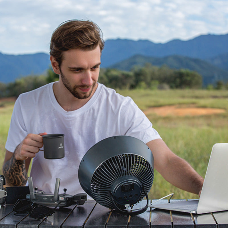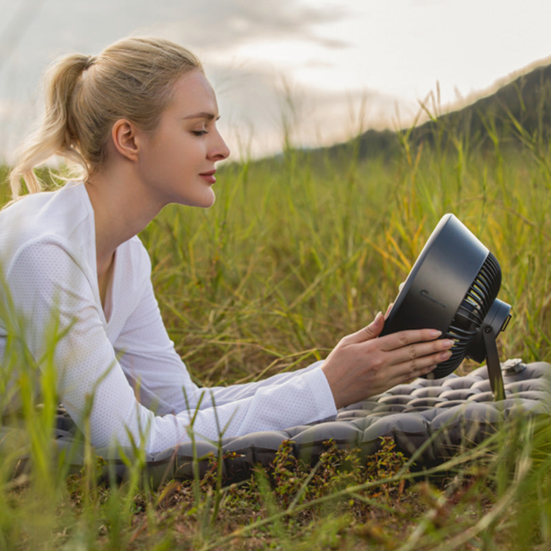 The Max Cooler is the ultimate 3-in-1 outdoor fan with a sleek aircraft engine design. This compact, rechargeable, and cordless fan offers powerful airflow up to 5 m/s with four adjustable speed settings. With a 9600mAh battery, the Max Cooler operates for 3.5-12 hours, doubling as an emergency power supply. Its IPX4 water resistance makes it a reliable companion for all your outdoor adventures.