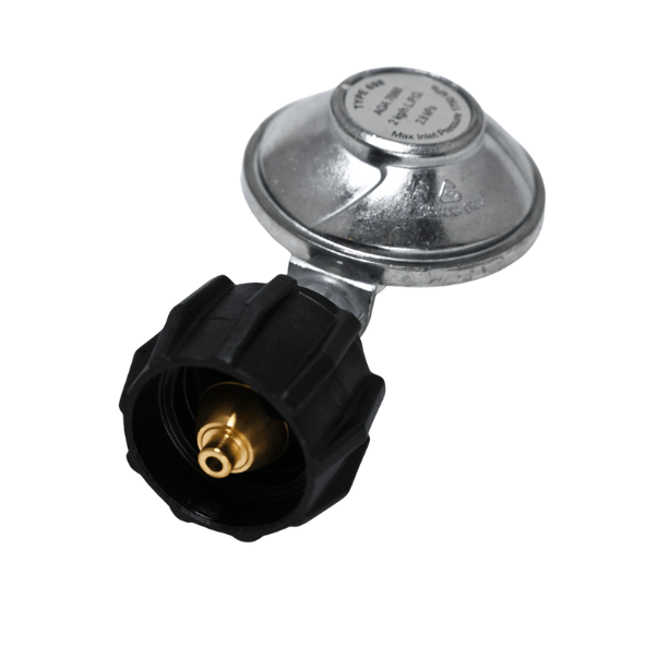 Compact and efficient 90 degree LPG (liquefied petroleum gas) regulator designed for safe, reliable gas flow from LCC27 (Leisure Cylinder Connection Type 27) cylinders to 3/8" BSP (British Standard Pipe) appliances.